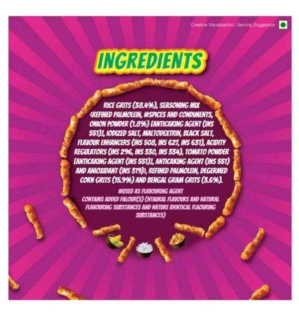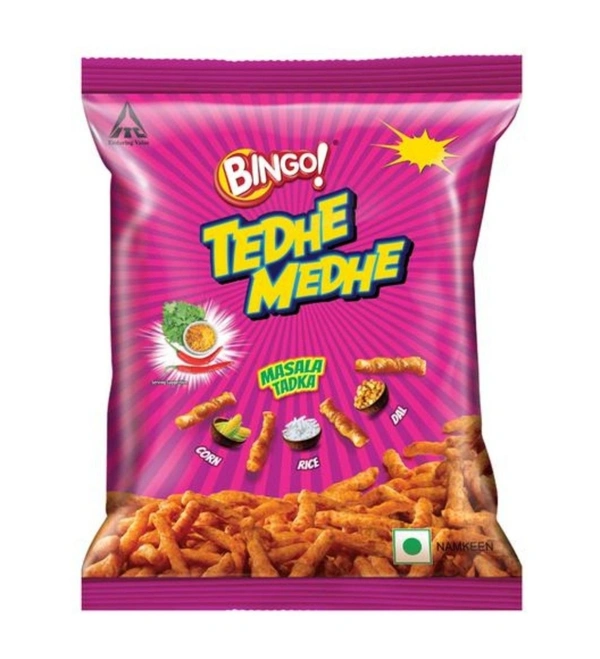 Add a masaledaar twist to your every day with Bingo! Tedhe Medhe as no two sticks are alike!, Made from dal, corn and rice, this spindle-shaped snack has a unique texture which gives it a delicious crunch. Take one bite of this masala tadka flavour and you won’t just stop at one. It will keep making you Eat Phir Repeat, on loop.