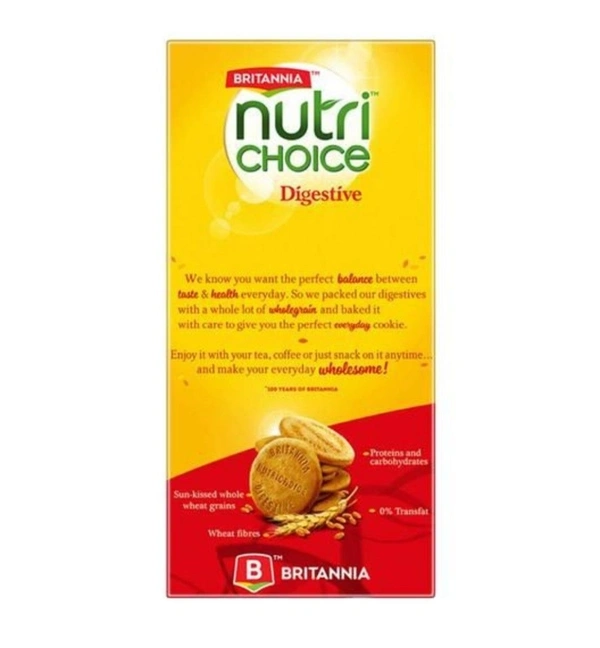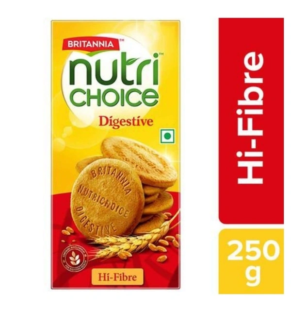 Britannia NutriChoice Digestive Biscuits are fibre rich biscuits packed with the richness of Whole wheat (atta) and bran. With every bite, you experience the coarseness of this fibre-rich healthy biscuit. These Digestive cookies are baked to precision, a perfect healthy snack. Go ahead and make a good choice.