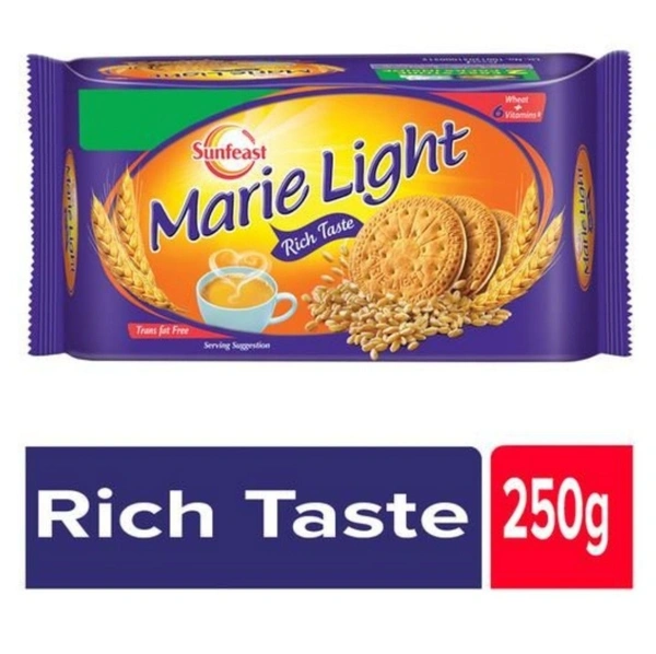 A Marie is a type of sweet biscuit similar to a Rich tea biscuit. While the Rich taste biscuit is the most popular version of this biscuit. It is balanced taste, crispiness and lightness along with the added vitamins and minerals makes Sunfeast Marie the healthy tea time biscuit with heavenly taste.