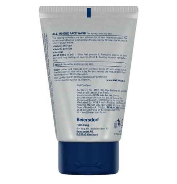 Nivea Men All-in-1 face wash reduces dark spots, acne and excessive oiliness with the regular wash. A multi-benefit face wash that solves all problems on your face without any hassle. What do you get? 10 skin nutrient's formula with Whitanat Vita Complex Plus for smooth, refreshed and radiant skin.